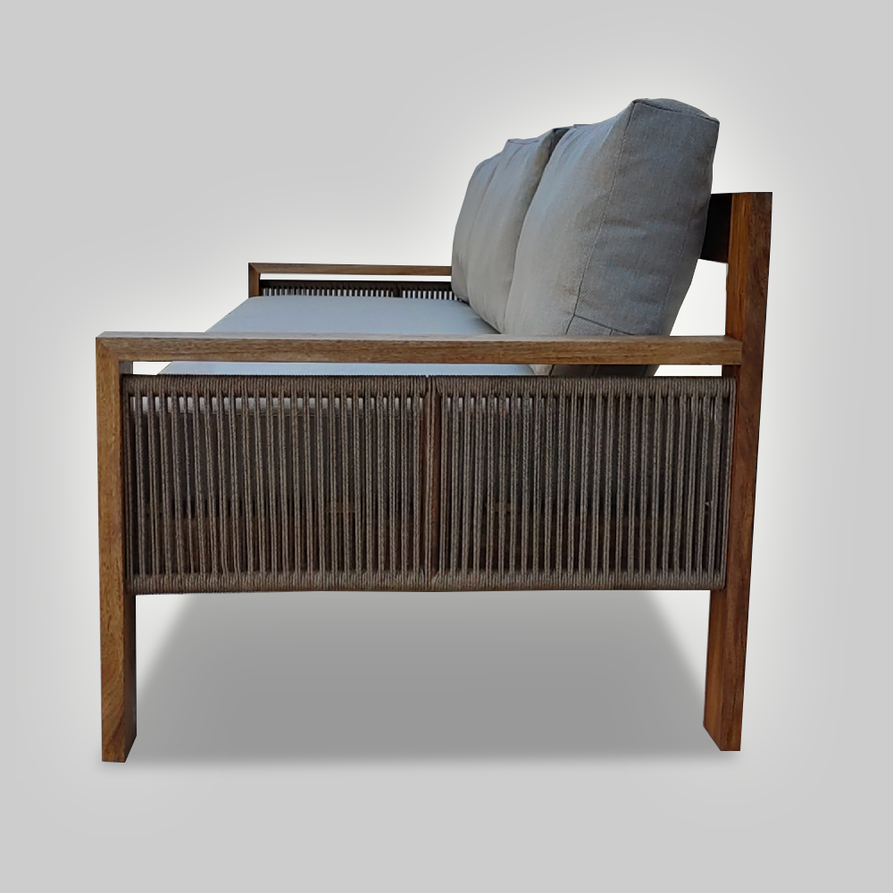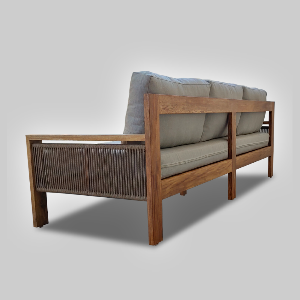 El Sofá Cholula es una pieza versátil que se adapta perfectamente tanto a interiores como exteriores, ideal para disfrutar de un espacio acogedor en tu sala o terraza. Fabricado en madera sólida de rosa morada, encino, parota, tzalam o teca, este sofá no solo brinda una estética sofisticada, sino también una resistencia excepcional a las condiciones exteriores, especialmente con maderas como tzalam y teca, conocidas por su durabilidad frente a la intemperie, hongos y termitas. cabe mencionar que cuando escoges madera de tzalam o teca la tela es también resistente al exterior.